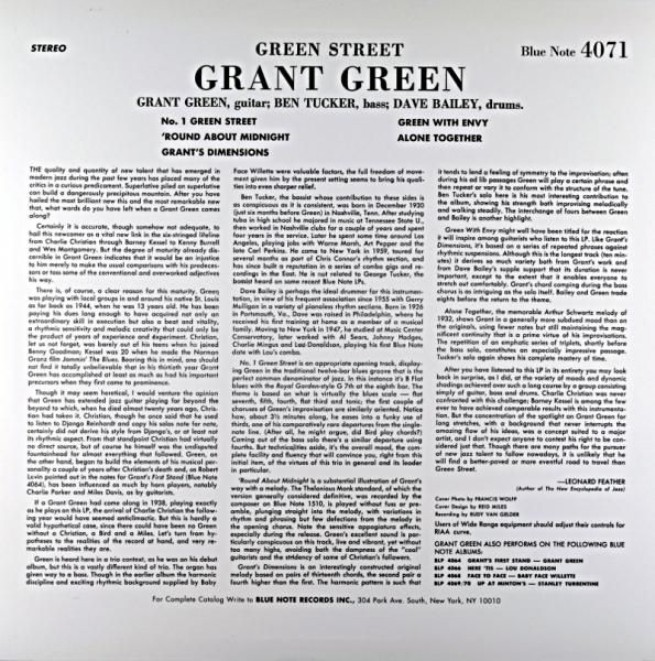 グラント・グリーンのブルーノート2作目はシンプルなギター・トリオのフォーマットで、チャーリー・クリスチャン直系のプレイによる代表作。B)ベン・タッカー、D)デイブ・ベイリーのリズムも好演。グラント・グリーンはブルーノートの制作企画の流れにそって自身を失わず、ハード・バップ〜ソウル・ジャズ〜ポップ路線〜ヒュージョンと係りあった。それぞれの分野での代表作があるほど流れに乗って活動し、サイドメンとしても多忙であった。そうしたグラント・グリーンのオーソドックスな一枚である。