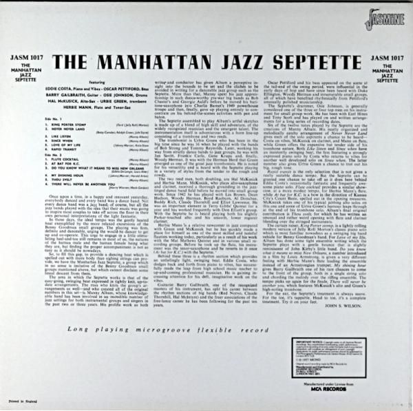 THE MANNHATTAN JAZZ SEPTETTEによる名演集である。アレンジはマニ―・アルバムが担当。集ったミュージシャンはP,VIB)エディ・コスタ、B)オスカー・ぺティフォードG)バリー・ガルブレイス、D)オシー・ジョンソン、AS)ハル・マクシック、TB)アービー・グリーン、FL,TS)ハービー・マンである。全12曲アレンジと各人の秀逸なアドリブによって短さを感じさせない。ハービー・マンのテナーの良さ、バリー・ガルブレイスの刻みとソロに魅了され、ぺティフォードの堅実なプレイ、エディ・コスタのパーカッシブなピアノと聴きどころの多いアルバムである。