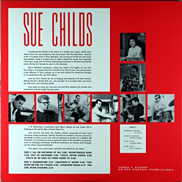 studio 4 はイリノイ州ロック・アイランドで設立されたマイナー・レーベルである。J.Rモンテローズの"IN ACTION"が有名それもV.S.O.Pレーベルより再発され、J.R参加のスー・チャイルズのボーカル・アルバムにコレクターの関心が集まり垂涎盤となった経過がある。J.Rの参加はA面の二曲、"ALL OR NOTHING AT ALL","YOU'D BE SO NICE TO COME HOME TO"。スー・チャイルズは母がシンガーだった事もあり、ショー・ビジネス界に憧れを持っていてコンテストにも参加、実績を積んでデトロイトを拠点に訪れたミュージシャン とセッションを行うなど経験を積んでいた様である。自身のアルバムに対する執着がJ.Rとの出会いとなって本アルバムを成就した。正に出会いの機微を感じさせる。