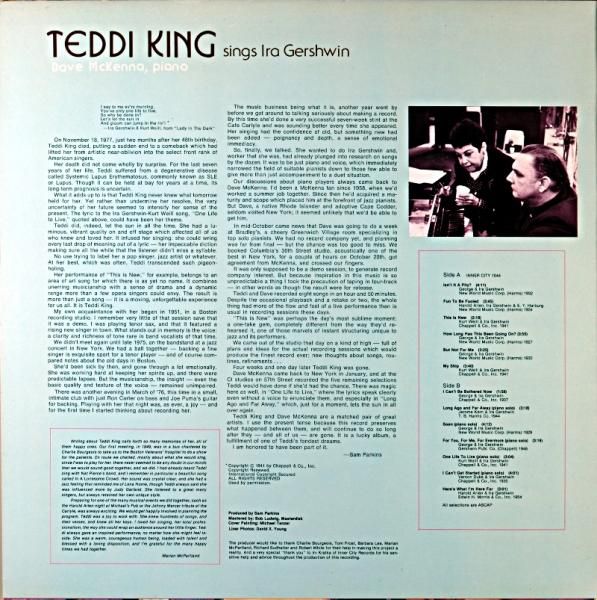 晩年のテディ・キングは病を患い歌への執着心が病を超えた様な気がする。それだけに本作、ピアノのデイブ・マッケンナとの対話は一段と説得力ある歌唱によって聴き手を魅了する。晩年テディ・キングがレコーディングにかける意欲が日々増していったことが窺えるガシューインナンバー13曲。