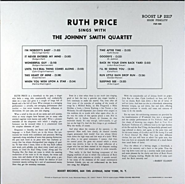 ルース・プライス18歳時の初アルバムである。バックはギターのジョニー・スミスのカルテットが担当、ヴァイブを擁したコンボ。ミルドレッド・ベイリー以降のジャズ・シンガーを研鑽、将来に期待感を抱かせる均整の取れたボーカルを聴かせている。収録曲は1T NEVER ENTERED MY MIND,UNTIL THE REAL THING COMES ALONG,WHEN YOU WISH UPON A STAR,TIME AFTER TIME,I'LL BEEING YOU,SLEEPING BEE,ETC
