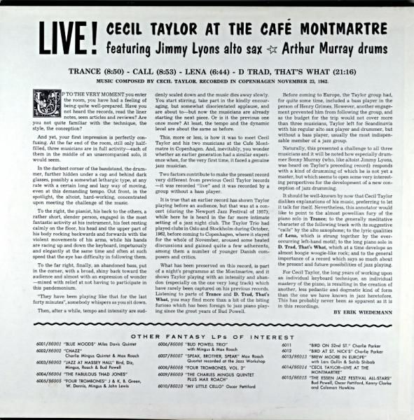 セシル・テーラー〜ジミー・ライオンズ〜サニー・マレーのレギュラー・トリオに依るスェーデンは"カフェ・モンマルトル"でのライブ・アルバムである。セシルのユニットとしての演奏スタイルが確立された最初のアルバム。"トランス","コール","レナ","トラッド・ザッツ・ホワット"の4曲を収録。テンションのきいたトリオのエキサイティングな演奏が展開されている。当夜の記録がもう1枚"ネフェルティティ、ザ・ビューティフル・ワン・ハズ・カム"としてリリースされている。