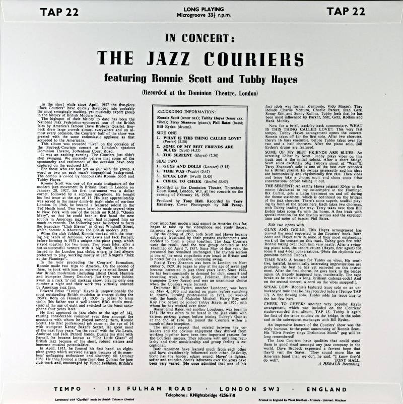 少年期よりヴァイオリン〜ピアノと習い始め13歳時でテナーに専念する。15歳時(1950年)のテナー・プレイを偶然目撃したロニー・スコットが敏感に反応、1957年タビー・ヘイズを迎えてのクインテット編成の"THE JAZZ COURIERS"を結成、このグループに依る1958年のライブ・アルバムが本作である。ブリティシュ・ジャズを牽引してきたロニー〜タビーの両者のエキサイティングなライブ・アルバムでテリー・シャノン以下のリズムセクションも好演。