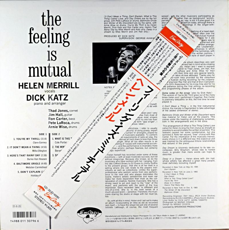 Ëܺî¤Ï60ǯÂåÃæ´ü¤Ë"MILESTONE"¤«¤é¥ê¥ê¡¼¥¹¤µ¤ì¥À¥¦¥ó¥Ó¡¼¥È»ï¤ÇºÇ¹âÅÀ¤ò¤¨¤¿¥¢¥ë¥Ð¥à¤Ç¡¢¤½¤Î¸å¥Ø¥ì¥ó¤¬¸¶ÈפòÇ㤤¼è¤ê"¥Ç¥£¡¼¥×¡¦¥¤¥ó¡¦¥¢¡¦¥É¥ê¡¼¥à"¤È¥¿¥¤¥È¥ë¤òÊѤ¨¤Æ¹ñÆâȯÇ䤵¤ì¤¿»ö¤¬¤¢¤Ã¤¿¡£80ǯÂå¤Ë¤Ê¤êÆüËÜ¥Õ¥©¥Î¥°¥é¥à/¥¨¥Þ¡¼¥·¡¼¡¦¥ì¡¼¥Ù¥ë¤ÇÅö»þ¤ò×Ç×ʤȤµ¤»¤ë¥¸¥ã¥±¥Ã¥È¤ÇºÆÈ¯¤µ¤ì¤¿¤â¤Î¤Ç¤¢¤ë¡£¥Ø¥ì¥ó¤Î¥¸¥ã¥º¥á¥ó¤È¤Î¥¢¥ë¥Ð¥à¤ÎºÇ¹âºî¤Ï"HELEN MERRILL WITH CLIFFORD BROWN"¤Ç¤¢¤ë¤¬¡¢¤½¤ì¤ËɤŨ¤¹¤ë¥¢¥ë¥Ð¥à¤¬Ëܺî"THE FDEELING IS MUTUAL"¤Ç¤¢¤ë¡£¥Ç¥Ã¥¯¡¦¥«¥Ã¥Ä¤Î¥Ô¥¢¥Î¤È¥¢¥ì¥ó¥¸¤Î²¼¥µ¥É¡¦¥¸¥ç¡¼¥ó¥º¡Á¥¸¥à¡¦¥Û¡¼¥ë¡Á¥í¥ó¡¦¥«¡¼¥¿¡¼¡Á¥Ô¡¼¥È¡¦¥é¥í¥«¡¢¥¢¡¼¥Ë¡¼¡¦¥ï¥¤¥º¤òÍʤ·¤¿¥»¥¯¥¹¥Æ¥Ã¥È¤Ç¤¢¤ë¤¬¡¢HERE'S THAT RSINY DAY¤Ï¥Ô¥¢¥Î¡¢YOU'RE MY THRILL¤Ï¥Ô¥¢¥Î¤È¥Ù¡¼¥¹¤Î¥Ç¥å¥ª¡¢DEEP IN A DREAM¤Ï¥®¥¿¡¼¡¢¥»¥¯¥¹¥Æ¥Ã¥È¤Ï6¶Ê¤ÈÊѲ½¤òÉÕ¤±¤¿ÆâÍÆ¤Ç²Î¼ê¤È¤·¤Æ¤Î±ß½Ï¤·¤¿¶ÃϤò´¶¤¸¤µ¤»¤ë½¼¼Âºî¤Ç¤¢¤ë¡£
