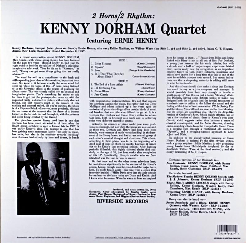 リバーサイドのケニー・ドーハムは、自身のボーカル・アルバムも含め様々に楽想を展開させた時期であった。本作も、タイトル通りドーハムとアーニー・ヘンリーに、ベースのエディ・マシアスとドラムスのG.T・ホーガンによるピアノレス・カルテット。(全8曲の内"SOON"のみドーハムがピアノを弾いている)ドーハムのオリジナル3曲にスタンダードを5曲を配した内容で、2ホーンの存在が強く印象ずけられた作品で、ドーハム〜ヘンリーの掛け合いが聴きどころである。尚、本セッションはアーニー・ヘンリーのラストセッション。豊かな才能の一端を本作からも十分感じられる内容に成っている。