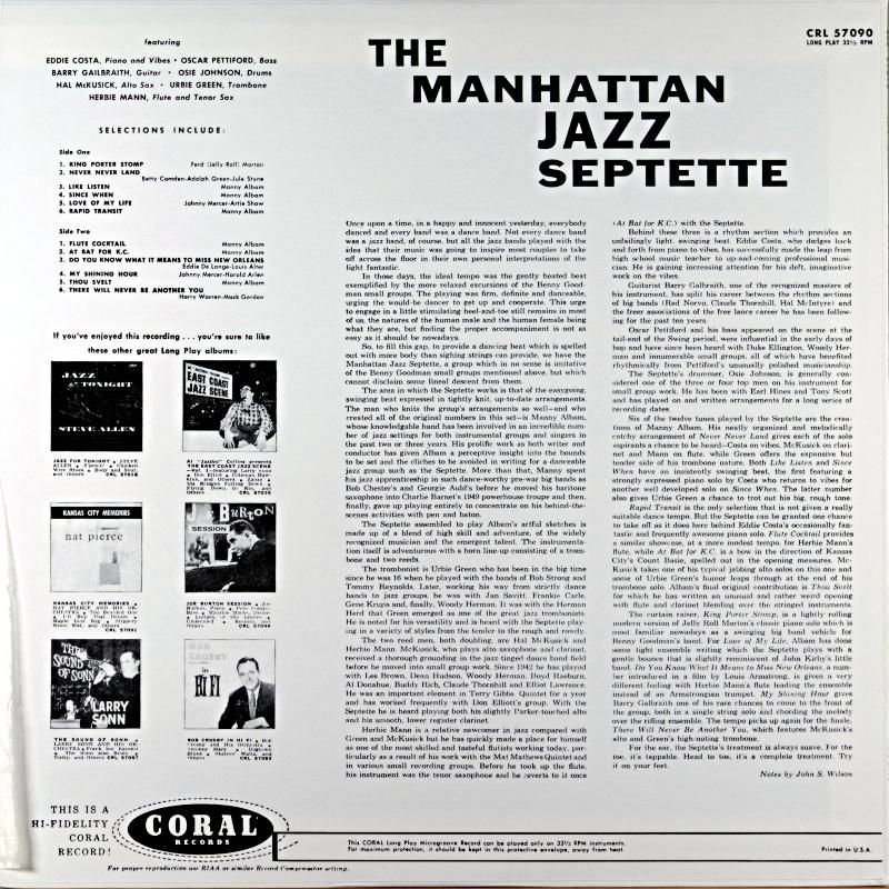 THE MANNHATTAN JAZZ SEPTETTEによる名演集である。アレンジはマニ―・アルバムが担当。集ったミュージシャンはP,VIB)エディ・コスタ、B)オスカー・ぺティフォードG)バリー・ガルブレイス、D)オシー・ジョンソン、AS)ハル・マクシック、TB)アービー・グリーン、FL,TS)ハービー・マンである。全12曲アレンジと各人の秀逸なアドリブによって短さを感じさせない。ハービー・マンのテナーの良さ、バリー・ガルブレイスの刻みとソロに魅了され、ぺティフォードの堅実なプレイ、エディ・コスタのパーカッシブなピアノと聴きどころの多いアルバムである。