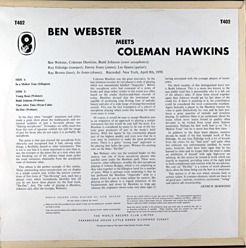 ¥Ù¥ó¡¦¥¦¥§¥Ö¥¹¥¿¡¼¡Á¥³¡¼¥ë¥Þ¥ó¡¦¥Û¡¼¥¥ó¥¹¤Ë¥Ð¥É¡¦¥¸¥ç¥ó¥½¥ó¤ò²Ã¤¨¤¿¥Æ¥Ê¡¼¤ÎµðƬ»°¼Ô¤Ë¡¢¥í¥¤¡¦¥¨¥ë¥É¥ê¥Ã¥Á¤ò²Ã¤¨¥ê¥º¥à¥»¥¯¥·¥ç¥ó¤Ë¤Ï¡¢¥¸¥ß¡¼¡¦¥¸¥ç¡¼¥ó¥º¡Á¥ì¥¹¡¦¥¹¥Ñ¥ó¡Á¥ì¥¤¡¦¥Ö¥é¥¦¥ó¡Á¥¸¥ç¡¼¡¦¥¸¥ç¡¼¥ó¥º¤òÇÛ¤·¤¿¥ì¥³¡¼¥Ç¥£¥ó¥°¡¦¥»¥Ã¥·¥ç¥ó¡£20ʬ¤òͤ¹¥¨¥ê¥ó¥È¥ó¤Î"IN A MELLOW TONE"ݤ¤´¤¿¤¨½½Ê¬¤Ê¥»¥Ã¥·¥ç¥ó¤Ë¤Ê¤Ã¤¿¡£¥ô¥¡¡¼¥Ö¤Î̾È×"BEN WEBSTER AND ASSOCIATES"¤Î¥¤¥®¥ê¥¹WORLD RECORD CLUB¤«¤é¤Î¥ê¡¦¥¤¥·¥å¡¼¤Ç¤¢¤ë¡£