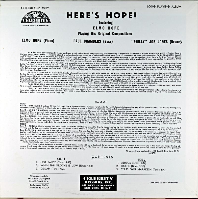 過ってセレブリティのエルモ・ホープのピアノトリオは、マニア垂涎のアルバムだった。アメリカのOJCの再発に触発されてV.S.O.Pレーベルからすんなりと再発され驚いた。サイドメンは B)PAUL CHAMBERS ,D)PHILLY JOE JONEで1961年録音。全6曲ホープのオリジナルに依るナンバーとなっており、豪華メンバーでのレコーディング・セッションは、やはりエルモ・ホープの代表作の一枚であることは揺るがない。