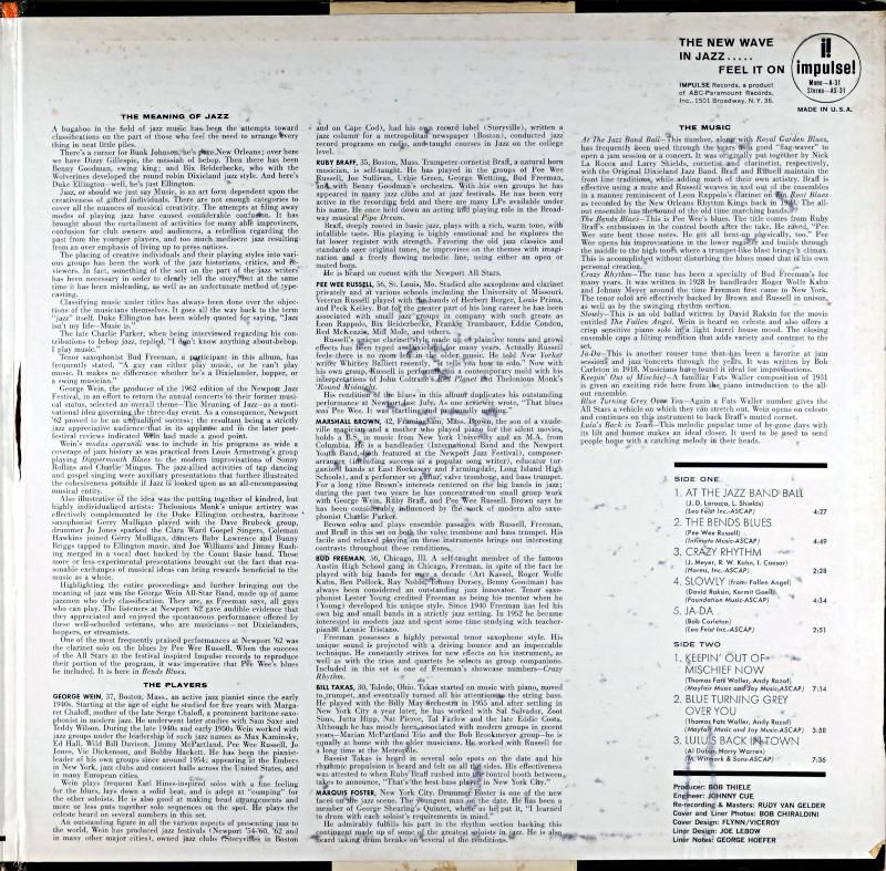 本作のメンバーは、P&LEADER) GEORGE WEIN ,CORNET) RUBY BRAFF ,TB)MARSNALL BROWN ,CL)PEE WEE RUSSELL ,TS)BUD FREEMAN ,B)BILL TAKAS ,D)MARQUIS FOSTER