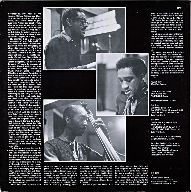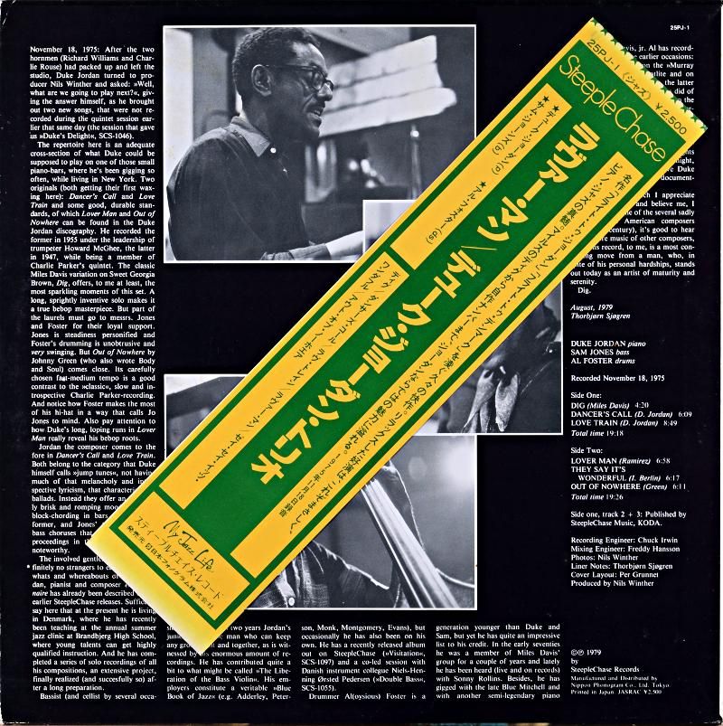 ステープルチェイスからのデューク・ジョーダンの諸作は、詩情あふれたデリケイトな感情の発露が随所に溢れ、聴き手の心を捉えて離さない深い味わいが感じられる。1975年11月18日録音の本作は,サイドメンにB)サム・ジョーンズ〜D)アル・フォスターを配した編成で、"DIG","DANCER'S CALL","LOVE TRAINH","LOVER MAN","THEY SAY IT'S WONDERFUL","OUT OF NOWHEREの全6曲。"FLIGHT TO DENMARK"に通ずるピアノ・トリオの秀作。