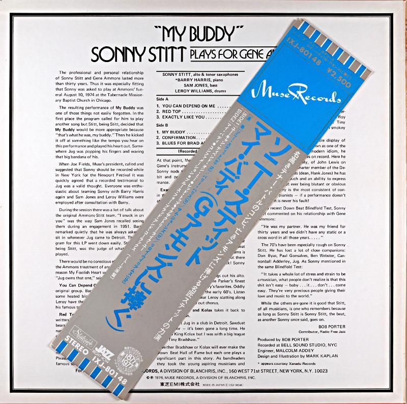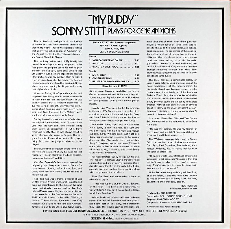 ソニー・ステット〜ジーン・アモンズは名コンビであり50年代を代表するグループであった。本作は亡きジーン・アモンズに捧げるソニー・ステットの力作。YOU CAN DEPEND ON ME ,RED TOP ,EXACTLY LIKE YOU ,MY BUDDY ,CONFIRMATION ,BLUES FOR BRAD AND KOLAXの全6曲。二人にとって思い出の多い選曲となっており、サイドメンはバリー・ハリス〜サム・ジョンズ〜ルロイ・ウイリアムス。ソニー・ステットの数多いアルバムの中で、最も愛着のある1枚であるに違いない。
