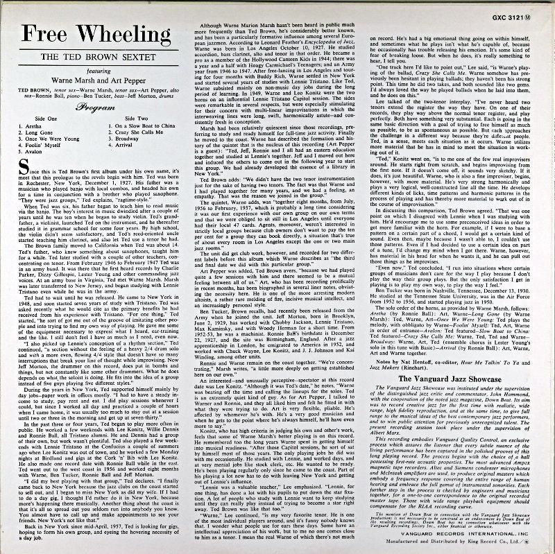 トリスターノ派のテナー、テッド・ブラウン、ウォーン・マーシュにピアノのロニー・ボール、ドラムスにジェフ・モートンそしてウエスト・コーストきってのインプロバイザー、アート・ペッパー、デビュー間もないベースのベン・タッカーを一堂に会した本セッションはロス近郊のジャズ・シーンで活動しただけあって、派を越えた親しみやすいスウイギーな各人のプレイが素晴らしい。取り分けブラウン〜マーシュのテナーサウンドとアート・ペッパーの協調性が大いに発揮され名コンボによる優れた録音となった。