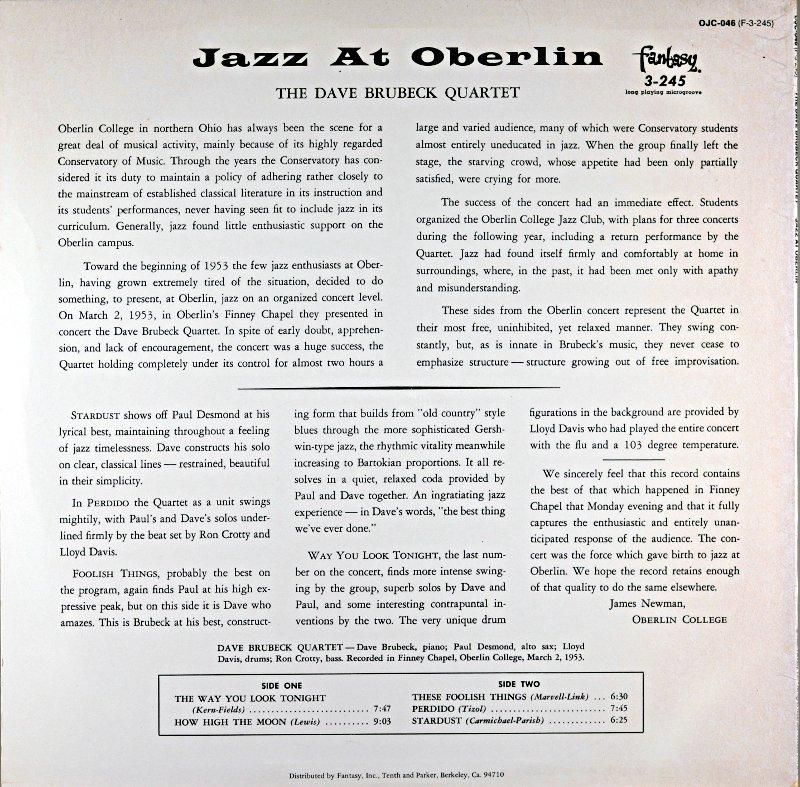 カレッジ・コンサートで名をあげたブルーベック・カルテットが、53年にオバーリン・カレッジで開いたコンサートの実況録音盤。THE WAY LOOK TONIGHT, HOW HIGH THE MOON, THESE FOOLISH THINGS, PERDIDO,STARDUSTの全5曲。スタンダード1曲に時間をかけて演奏、ブルーベック〜デスモンド共々若々しくフレッシュな快演集と成っている。