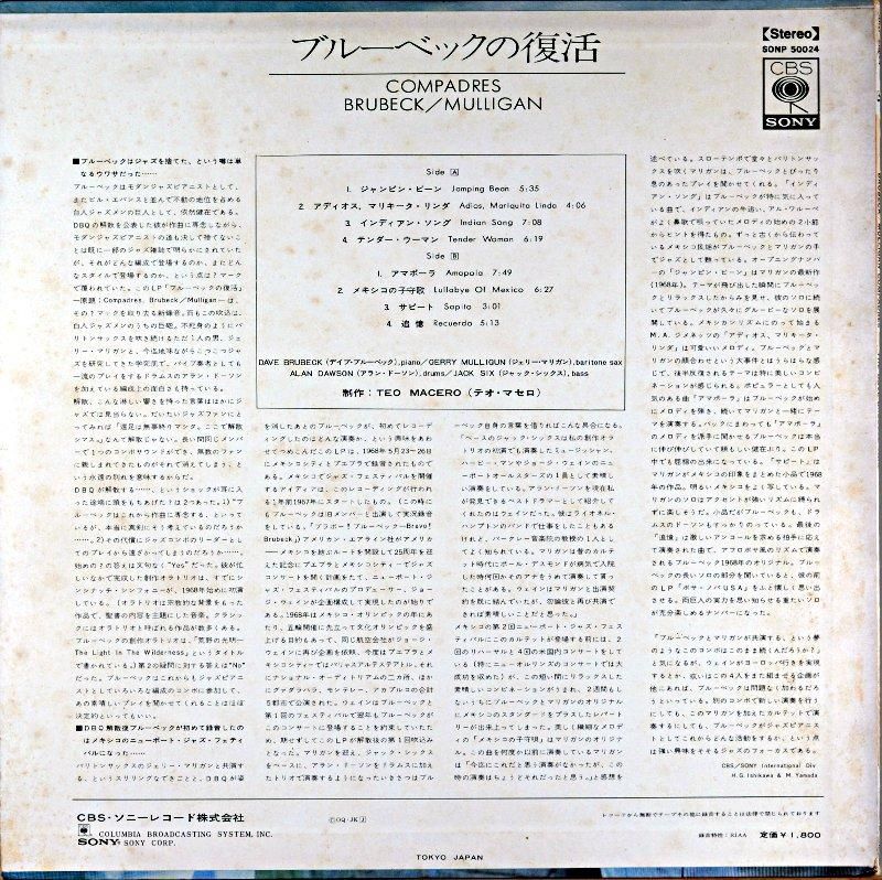 デイブ・ブルーべックがジェリー・マリガンとのコンビを組んだ最初のアルバム。1968年5月23日〜26日メキシコシティとプエブラで録音されたものである。サイドメンは、B)ジャック・シックス〜D)アラン・ドウソンに依るカウテット。ブルーベック3曲、マリガン3曲のオリジナルにアマポーラ〜アディオス、マリキータ・リンダの全8曲。魅力溢れるブルーベックとマリガンのカルテットが好調にスタートした好アルバムである。