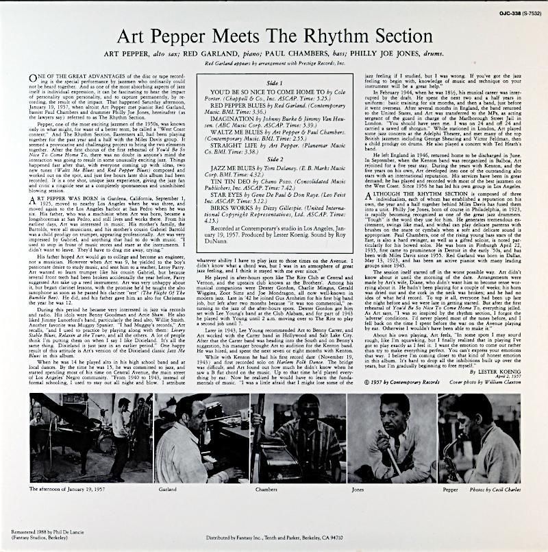 マイルスのリズム・セクション、レッド・ガーランド〜ポール・チェンバース〜フィリー・ジョー・ジョーンズとの 1957年11月19日LAでの一期一会のレコーディング・セッション。自伝に依れば当日は、体調万全と言える状態ではなかったが、最強のリズムセクションに触発され、YOU BE SO NICE TO COME HOME TO〜IMAGINATION〜STRAIGHT LIFE〜STAR EYESなどペッパーの本領を発揮したプレイが聴かれる。数少ないスーパー・セッションの一枚、