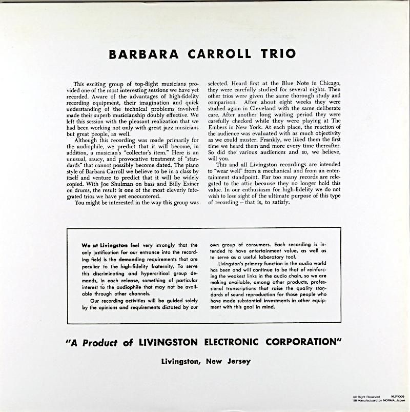 ババラ・キャロルはレナード・フェザーの著書「インサイド・ビバップ」の中で女性初のバップ・ピアニストとして紹介されている。50年に初リーダーセッションがディスカバリーでレコーディングされ,アトランテックでの録音を経て、本作LIVENGSTON LABELでの録音となった経過が垣間見える。THE GENTLEMAN IS DOPE~EASY LINVING~ALONE TOGETHER~MAKING WHOOPEE~ I CAN’T GET STARTED~ST.LOUIS BLUESの全6曲,しなやかなピアニズムを聴かせている。