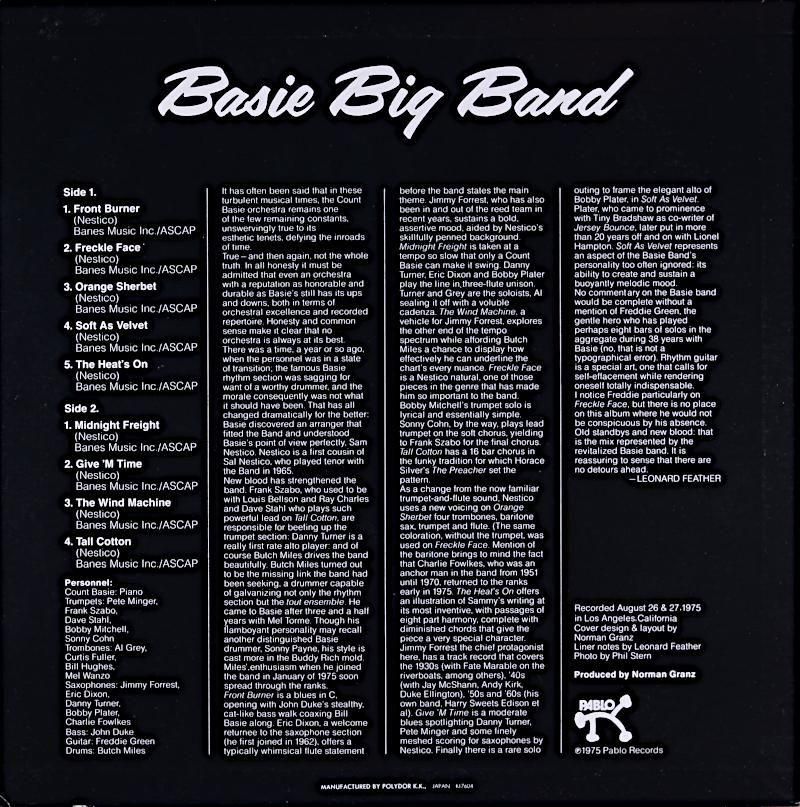 パブロと契約してからコンボ・サイズのアルバムが目立ったが、本作の全曲が、サム・ネスティコのオリジナル。伝統に培われたベイシー・バンドの魅力に、今日性を加味してある。まさに“オールド・ワイン・ニュー・ボトル”である。主なメンバーは、ジミーフォレスト〜エリック・ディソン〜チャーリー・フォークスの3人が復活し、ブラス・セクションにカーティス・フラーの参加、アル・グレーの再登場も目を引く。このバンドが1970年代になっても新鮮さを失わず、不変の魅力を保っている好アルバム。