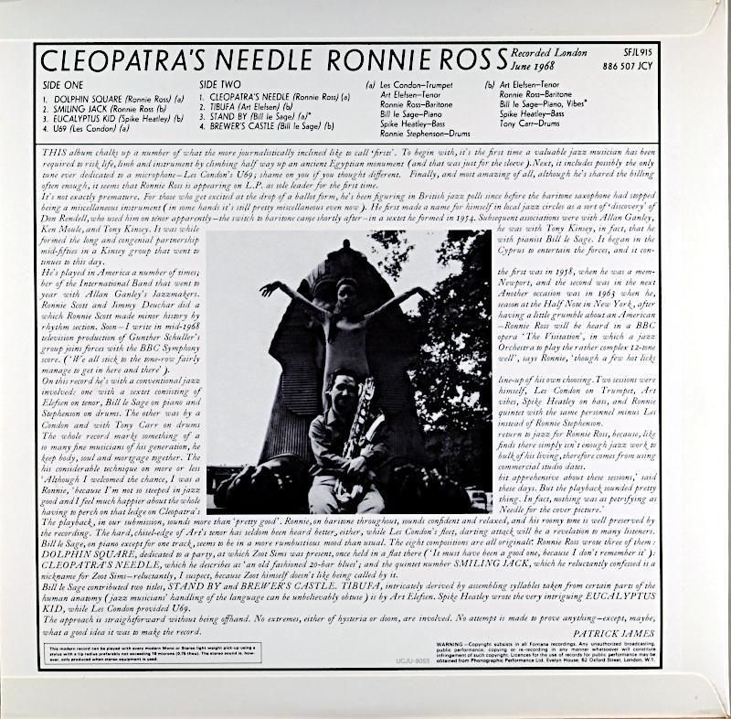 英国ジャズ界の重鎮ドン・レンデルと親しくなり、バリトン奏者に転向。1954年に初レコーディングを果たすロニー・ロス。1958年には、自己のクインテットで初リーダー作『ストンピン』を録音。ジョニー・ダンクワースやクラーク=ボラン・ビッグ・バンド、さらにはタビー・ヘイズの楽団などに参加、1960年代を通じてファースト・コールのバリトン奏者の一人だったと言っても過言ではない。1968年の本作は、ロニー・ロスのセクステットとクインテットをAB面に配した充実作であり、寡作家ロニー・ロスを忍には格好のアルバムである。