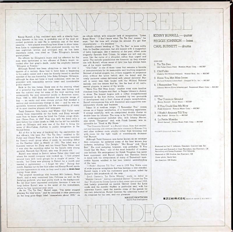 ジャズ・ギターにおけるメインストリーマーを、次々と登場させ秀作をリリースしてきたコンコード・レーベルから、ケニー・バレルのスムーズ&グルーヴィー、至芸に一段と磨きがかったバレルの快作が、遅きに期した感があるにせよリリースされたことを喜びたい。サイドメンに、B)レジー・ジョンソン〜D)カール・バーネットに依るトリオ編成。主な収録曲は、TIN TIN DEO〜OLD FOLKS〜HAVE YOU MET MISS JONES〜I REMEMBER YOU〜THE COMMON GROUND〜IF YOU COULD SEE ME NOW〜I HADN’T ANYONE TILL YOU〜LA FETITE MAMBOの全8曲。続編を期待したい。
