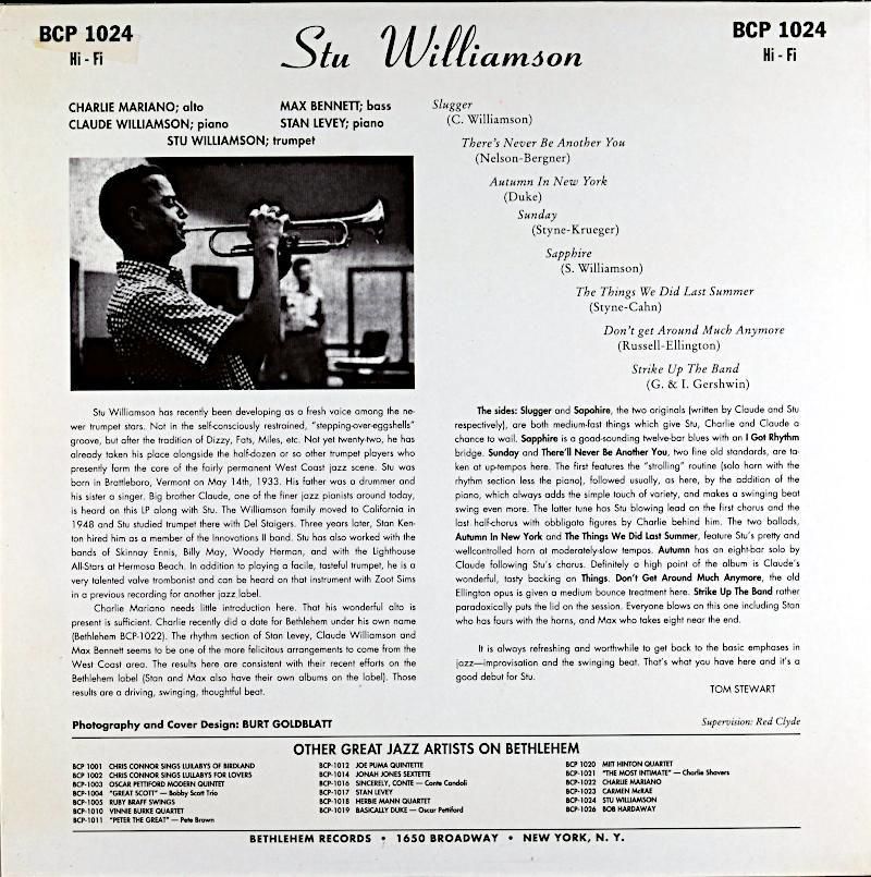 ピアニストであるクロード・ウイリアムソンの実弟。トランペット奏者としてビリー・メイ〜チャーリー・バーネット〜スタン・ケントン〜ウディ・ハーマンなどのバンド歴がある。ウエストコースト・ジャズの担い手として注目を浴びシェリー・マン5重奏団のメンバーとして活動した。こうしたスチュー・ウイリアムソンの初リーダー作の本作は、チャーリー・マリアーノ〜クロード・ウイリアムソン〜マックス・ベネット〜スタン・レビーに依るスタンダード中心の選曲に依るフレッシュな10インチに依る初リーダー作、LPサイズでの復刻盤である。