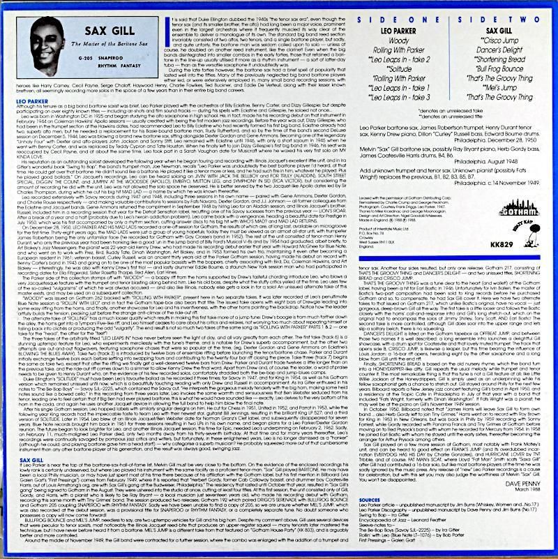A面にレオ・パーカーのセッション7曲、B面にサックス・ギルのセッション7曲を配したアルバム。レオのセッションには、ケニー・ドリューが、サックス・ギルのセッションにはレイ・ブライアントが参加しており、バリトン奏者二人をサイドからサポートしている、二人のピアニストの参加は、コレクターにとって気になるアルバムに違いない。