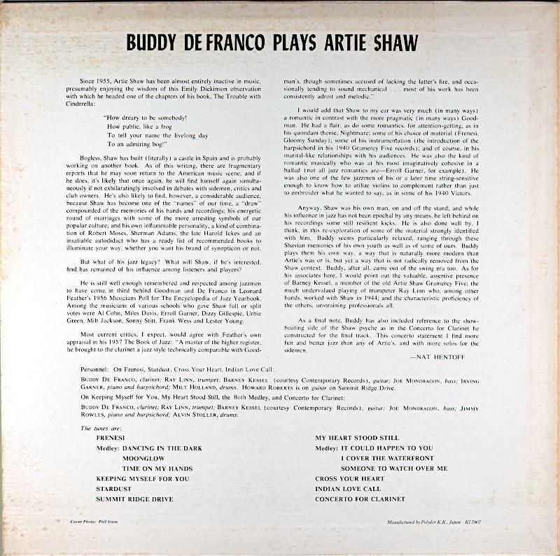 デフランコに影響を与えた、ベニー・グットマンとアーティ・ショーがデイフランコの出発点であった。サイドメンにトランペットのレイ・リン〜ジミー・ロウルズ〜バーニー・ケッセル〜ジョー・モンドラゴン〜ミルト・ホランドに依る好セッションで、フレネシー〜ムーングロウ〜スターダスト他全10曲の内容。