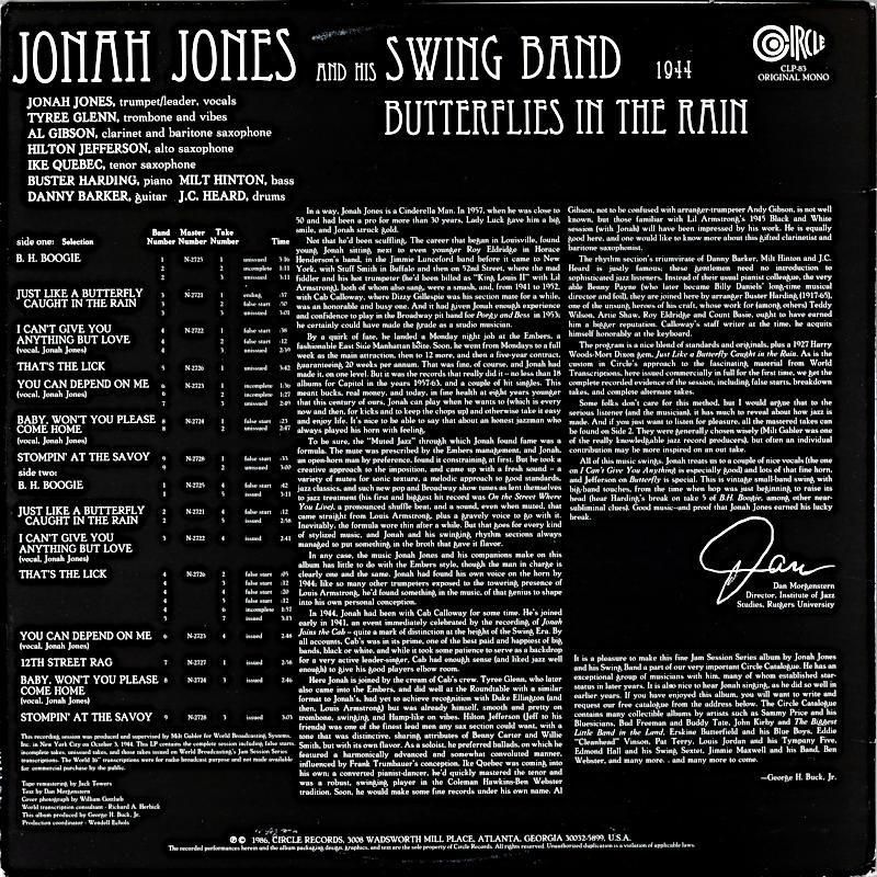トランペット奏者ジョナ・ジョーンズのスイングバンドによるリーダー・アルバム。共演のサイドメンが充実している好録音盤。タイリー・グレン〜ヒルトン・ジェファーソン〜アイク・ケベック〜ミルト・ヒントンらナインテットに依る好セッション。各人のソロが十分楽しめる、取り分け録音の少ないアルトのヒルトン・ジェファーソンの参加がうれしい。